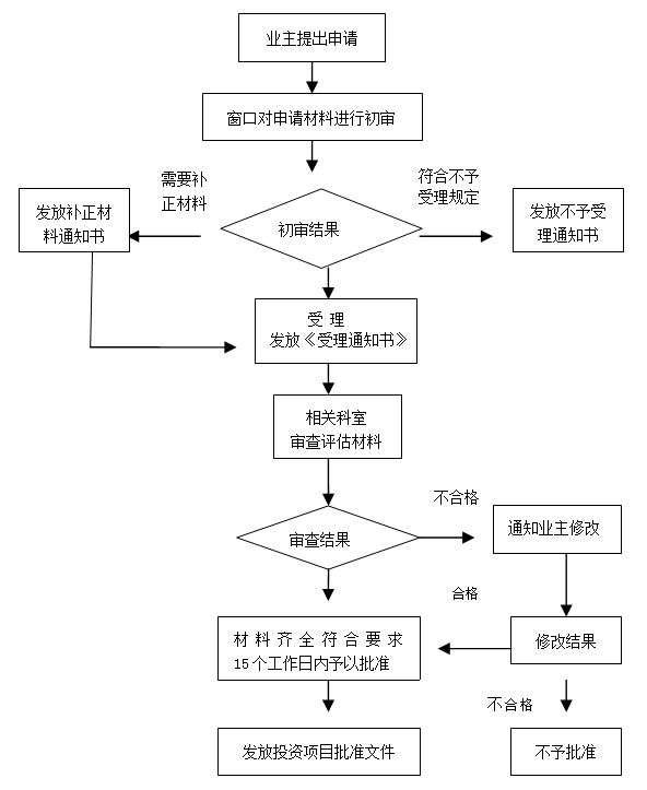 业主申报→窗口受理→评审或评估→审批(符合条件的)→送达批复文件。