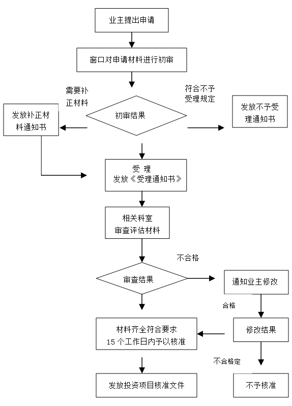 业主申报→窗口受理→评审或评估→核准(符合条件的)→送达核准批复。