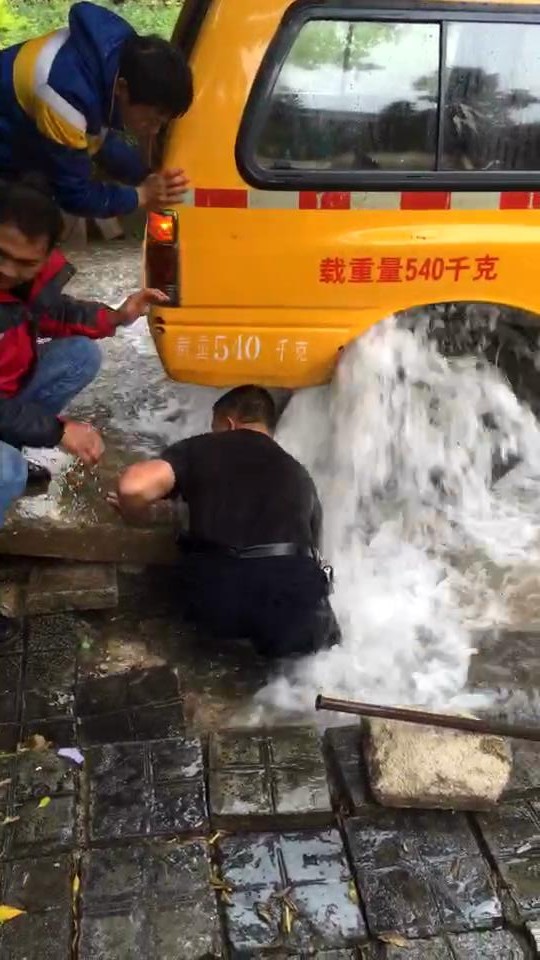 文山市环城北路复烤厂门口市政消防栓遭损坏,图为文山供排水总公司用工程车堵住出水口,积极开展抢修工作