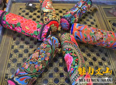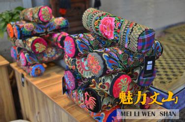 博雅公司成立于2005年,是一家文山本土企业,致力于将民族元素与当地特产、特色相结合,为消费者提供独一无二的时尚产品。2015年,该公司设计团队依托三七+刺绣的创新理念,将三七叶经过晾晒、杀虫、消毒、手工揉碎下,填充到颈椎保健枕内,并加上了壮族太阳鸟图案、苗族水波图案、彝族马缨花图案等一系列具有文山当地少数民族特色的的刺绣图案枕套,研发出这款“神奇”的具有浓郁文山特色的文化创意产品——三七叶绣花保健枕,枕头不但拥有美丽时尚的外型,还具有保护颈椎、安神助眠的保健功效。