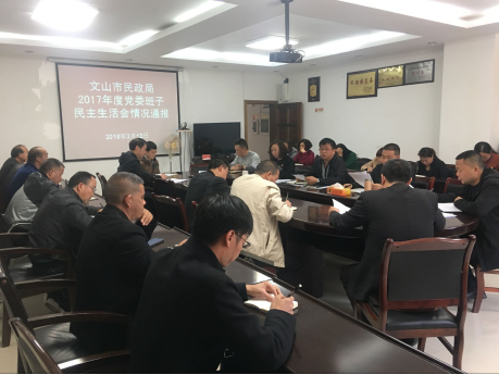 局领导班子成员和中层干部共23人参加,会议传达学习全市组织工作会议精神,对文山市民政局党委班子2017年度民主生活会召开情况进行了通报。局党委书记、局长郭光才同志就如何贯彻落实全市组织工作会议精神提出了要求。一要充分认清形势任务,依据习近平新时代中国特色社会主义思想和党的十九大精神,切实按照州、市组织工作要求,圆满完成党建工作任务。二要党委支部要不断强化理论武装,把握政治教育的思想性、指导性和针对性,进一步夯实全体干部、职工的政治理论根基。三要局党委、支部要认真领会全市组织工作座谈会暨组织委员会议精神实质,科学统筹2018年度组织工作,确保基层党建巩固年各项任务有效落实。