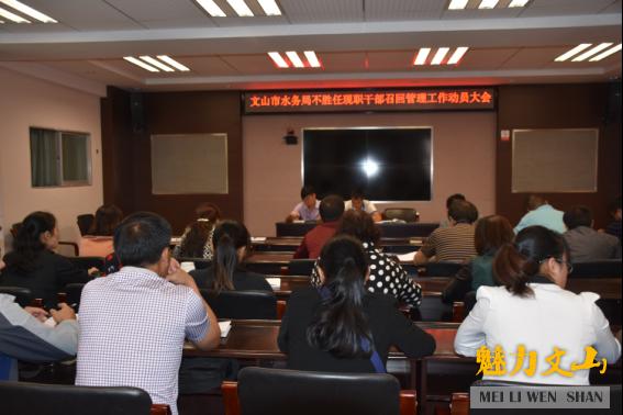为进一步推进不胜任现职干部召回管理工作,进一步抓好水务队伍作风建设,10月26日,文山市水务局召开不胜任现职干部召回管理工作动员大会,对市水务局开展不胜任现职干部召回管理工作进行动员部署。市水务局干部职工共62人参加了会议。
