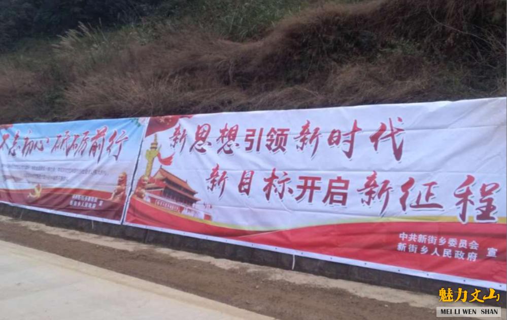 党的十九大胜利召开以来,为在全乡掀起学习党的十九大精神热潮,让广大干部群众深刻领会其精神实质和丰富内涵,把这一重要思想贯彻到决战脱贫攻坚、决胜同步小康的进程中。新街乡多形式的开展宣传活动,为了让党的十九大精神落地生根,新街乡制作了十九大精神宣传标语和宣传画册,在各村人流集中和显眼的位置将党的十九大会议精神悬挂和张贴起来,实现了宣传十九大精神全覆盖,进一步的加强了党员对十九大精神的认知,让更多的村民通过身边的宣传标语学习十九大精神,共悬挂标语180条,张贴十九大精神画册182张,营造着浓厚的学习宣传氛围,把党的声音传到了家家户户。
