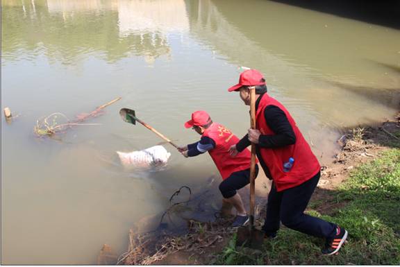 图为文山市审计局志愿者在打捞河床中的垃圾