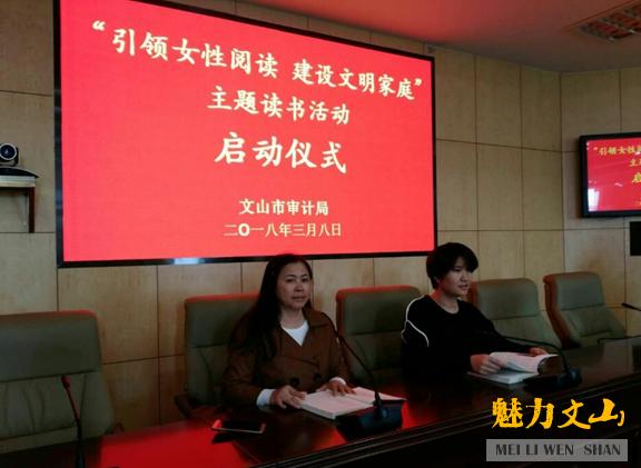 为深入开展精神文明创建,贯彻落实党的十九大精神,培育践行社会主义核心价值观,弘扬中华民族传统家庭美德,文山市审计局开展以“引领女性阅读·建设文明家庭”为主题的读书活动。局党组书记高兰芳、局长邓红英参加了启动仪式,并对此次活动提出要求,希望通过此次活动引领单位女职工阅读,推动家庭阅读、传承良好家风、弘扬家庭美德、倡导健康文明的生活方式,同时结合工作、生活实际引导广大女职工积极向上,热爱读书,提升生活品质,强调全体女职工积极参与此次活动,发挥女性在建设文明家庭中的主力军作用,为建设文明和谐社会奉献力量。