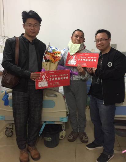 图为志愿者为好人田维言送鲜花