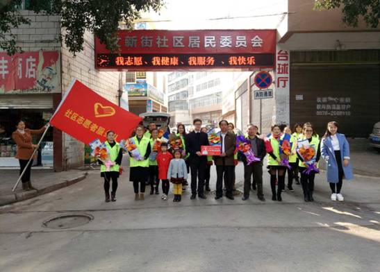 图为社区志愿服务队送花场景