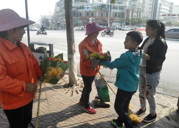 图为少年志愿者为环卫工人献花