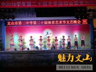 为隆重庆祝文山市第二中学第二十届冬季运动会的顺利召开,增进班级之间的交流,增强集体的凝聚力,提高师生的团结协作意识,打造我校学生团结、互助、和谐的风貌形象,传承校园文化,展示农村艺术教育成果,丰富大家的课余生活。近日,校团委组织举办了第二十届体育艺术节文艺晚会。