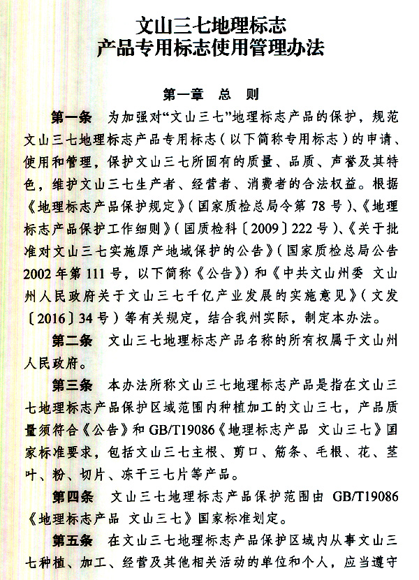第十九条 根据《地理标志产品保护规定》第二十三条规定,专用标志使用单位应当按照文山三七国家标准的规定生产加工文山三七。
