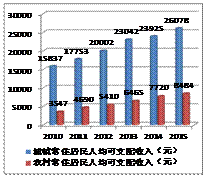 2015年的17.2亿元,年均增长20.4%;社会消费品零售总额由2010年的45.1亿元增加到2015年的86.9亿元,年均增长14%;城镇常住居民和农村常住居民人均可支配收入分别由2010年的15837元、3547元增加到2015年的26078元和8484元,年均分别增长10.5%和19.1%。