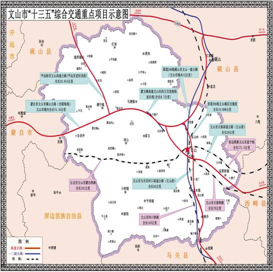 铁路:师宗—丘北—文山、沿边铁路(蒙自—文山—富宁—那坡)、文山—天保、文山—河口等铁路和城市轨道交通项目(文山城区轨道交通1号线、2号线)。 高速公路:蒙自—文山—砚山、平远—文山、文山—天保、师宗—丘北—砚山—文山—马关高速公路,文山—平坝—八寨—河口高等级公路。 一级公路:机场大道、蒙文砚高速文山东西立交连接线延长线、省道206线文山城区过境段公路。 二级公路:文山—马塘—秉烈—炭房公路、海子边—马塘—文山公路、古木—平坝—小街—屏边和平公路、薄竹老回龙—稼依小石桥公路。 三级公路:老回龙—薄竹山雷达站公路、德厚—亚拉冲—鸣鹫公路。 四级公路:通行政村道路硬化257公里。 农村公路:通乡通村道路改造1150公里。 航空:文山一类通用机场 |